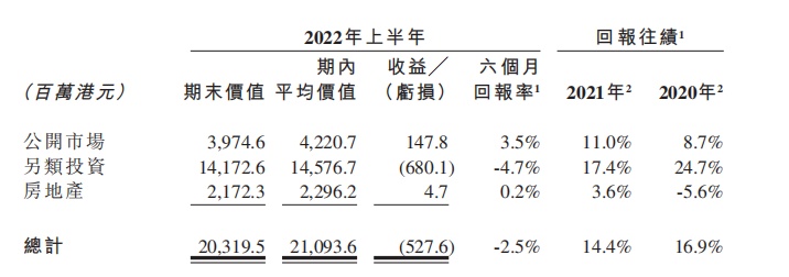 就业绩表现而言,2022年上半年,私募股权分项亏损3.73亿元,这一部分的亏损主要是由于加息、中美关系持续紧张及中国监管不断收紧的逆风影响,这导致其部分上市投资组合公司因并未退出或受锁定限制的情况下产生按市值计价的亏损。换句话说,这部分亏损仅为账面上的波动,并未发生变现亏损。此外,对冲基金分项亏损3.07亿元,新鸿基公司从去年开始一直向市场中性策略调整来降低风险,然而仍难免受外部环境冲击,2022年上半年,Eurekahedge亚洲对冲基金指数下跌12.4%。