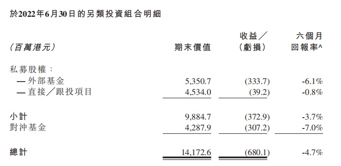 众所周知,投资管理业务是新鸿基公司盈利的重要组成部分之一,该业务由另类投资(资产占比70%)、公开市场(资产占比19%)及房地产(资产占比11%)组成。因此,该业务核心为另类投资,即包括私募股权(外部基金和直接/跟投项目)及对冲基金。