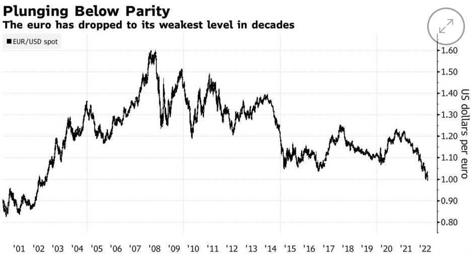 智通财经APP获悉,欧元今年遭受重创,欧元兑美元汇率下跌近13%,原因是日益强硬的美联储推高了美元汇率,而临近俄乌战争的欧洲经济前景恶化。周一,欧元兑美元汇率今年第二次跌破平价,跌至0.9926,为2002年以来的最低水平。欧元的贬值似乎才刚开始。