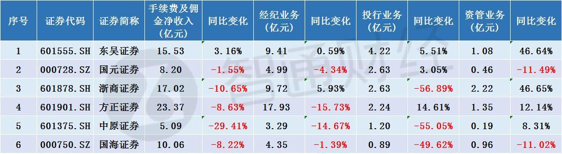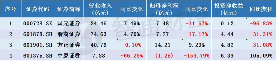 根据各家券商中报显示,上半年,国元证券、浙商证券上半年营业收入同比正增长,但均增收不增利,归母净利润同比均下跌。方正证券营收微微下滑,但其归母净利润增近10%,中原证券则由盈转亏,归母净利润同比下滑154.79%。