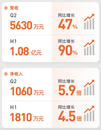 2022年第二季度,该公司净收入达1060万元人民币,同比增长5.9倍;总营收同比增长47%至5630万元人民币。上半年,净收入1810万元人民币,同比2021财年取得4.51倍的强劲增长;总营收同比增长90%至1.08亿元人民币。