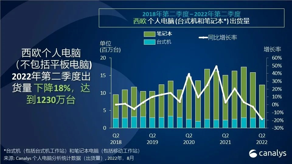 智通财经APP获悉,Canalys数据显示,2022 年第二季度,供需双方的强劲阻力,导致西欧的个人电脑出货量连续第二个季度下滑;笔记本电脑和台式机的总出货量更是骤降至 1230 万台,同比下跌 18%。笔记本电脑受到的打击最为严重,出货量同比下降26% 至 950 万台。相反,台式机的表现却好得多,商业需求上升,推动该品类出货量在2022 年第二季度同比增长 22% 至 270 万台出货量。消费市场中的平板电脑表现较为萎靡,相比去年缩减 24% 至590 万台。