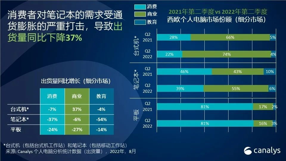 Canalys 研究分析师Kieren Jessop 表示:“2022 年第二季度除了前所未有的供应问题外,日益严重的通胀问题也使得西欧消费者对个人电脑的需求受到影响。欧盟统计部门Eurostat 的报告显示,欧元区第二季度的通货膨胀率平均约为 8%。乌克兰战争导致的能源成本上升是通胀的罪魁祸首。6月,欧元区的能源价格相比去年增长了42%。在这种通胀环境下,消费和商用领域的业务正在发生重大转变。许多用户因家庭预算吃紧不得不推迟购买新设备,导致第二季度的台式机和笔记本电脑出货量下降34%。与之形成鲜明对比的是,疫情后期欧洲地区各国经济开始复苏,企业复产复工和混合工作方式,使得企业对高质量设备的需求仍然相对强劲,非教育类商用个人电脑的出货量微降3%。资金实力雄厚的大型企业,仍然愿意、并且也有能力去更新员工的设备,升级办公室 IT 基础设施。尽管经济状况恶化,但拥有强大的渠道关系,侧重于提供商用产品和相关服务的个人电脑厂商,将在该地区拥有更为良好的表现。”