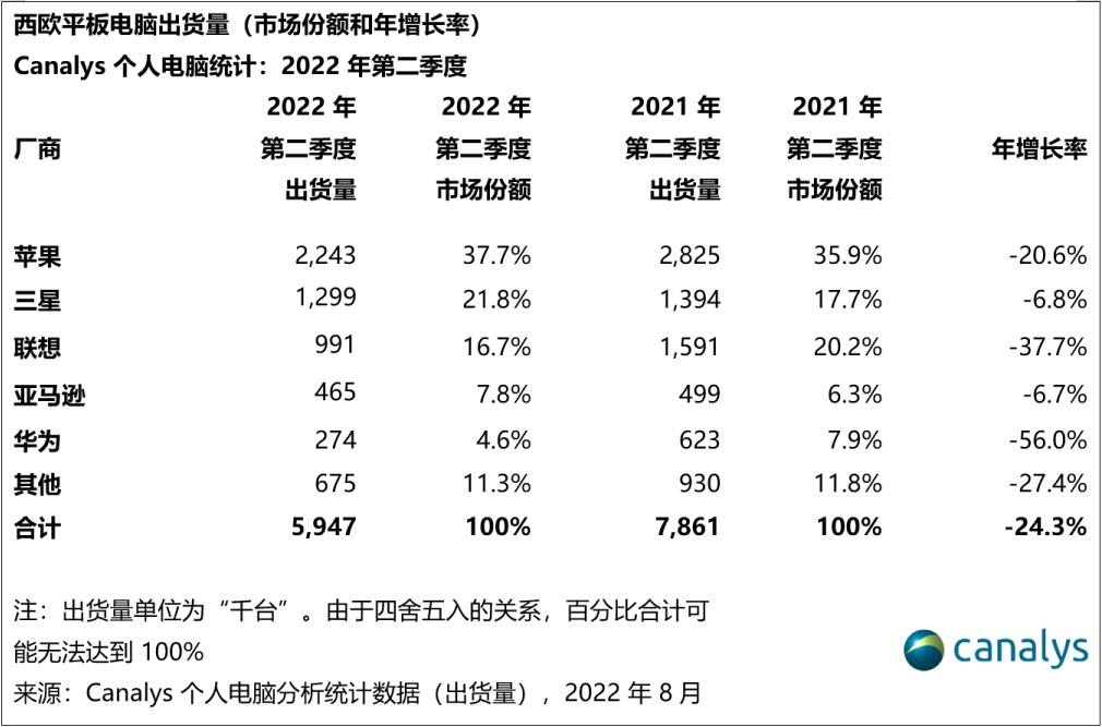 尽管第二季度的出货量同比下降 20% 至 220 万台,苹果仍连续八个季度蝉联西欧最大平板电脑厂商的宝座。三星在第二季度市场份额获得4%的显著增长,总出货量达到 130 万台。排名第三位的联想和第五位的华为,是2022 年第二季度遭受打击最大的两大品牌,分别下滑 38% 和56%,亚马逊则以相对温和的 7% 跌幅位居第四。