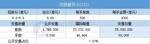 智通财经APP获悉,8月23日,苏新服务(02152)配售结束。配售招股价8.6-9.6港元,最终定价8.6港元,每手4300港元。