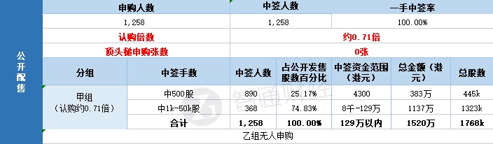 其中,公开配售申购人数1258人,一手中签率100%,认购倍数约0.71倍。