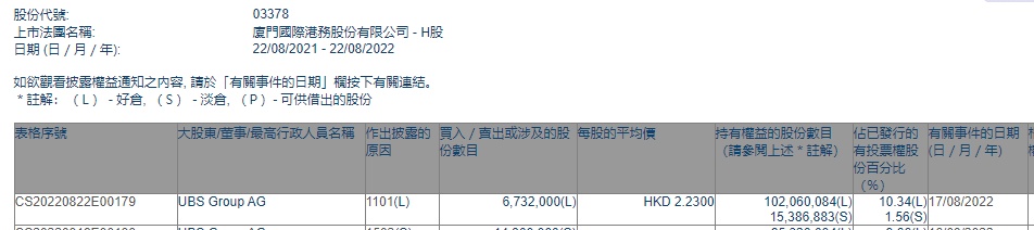 智通财经APP获悉,香港联交所最新资料显示,8月17日,UBS Group AG增持厦门港务(03378)673.2万股,每股作价2.23港元,总金额约为1501.24万港元。增持后最新持股数目约为1.02亿股,最新持股比例为10.34%。
