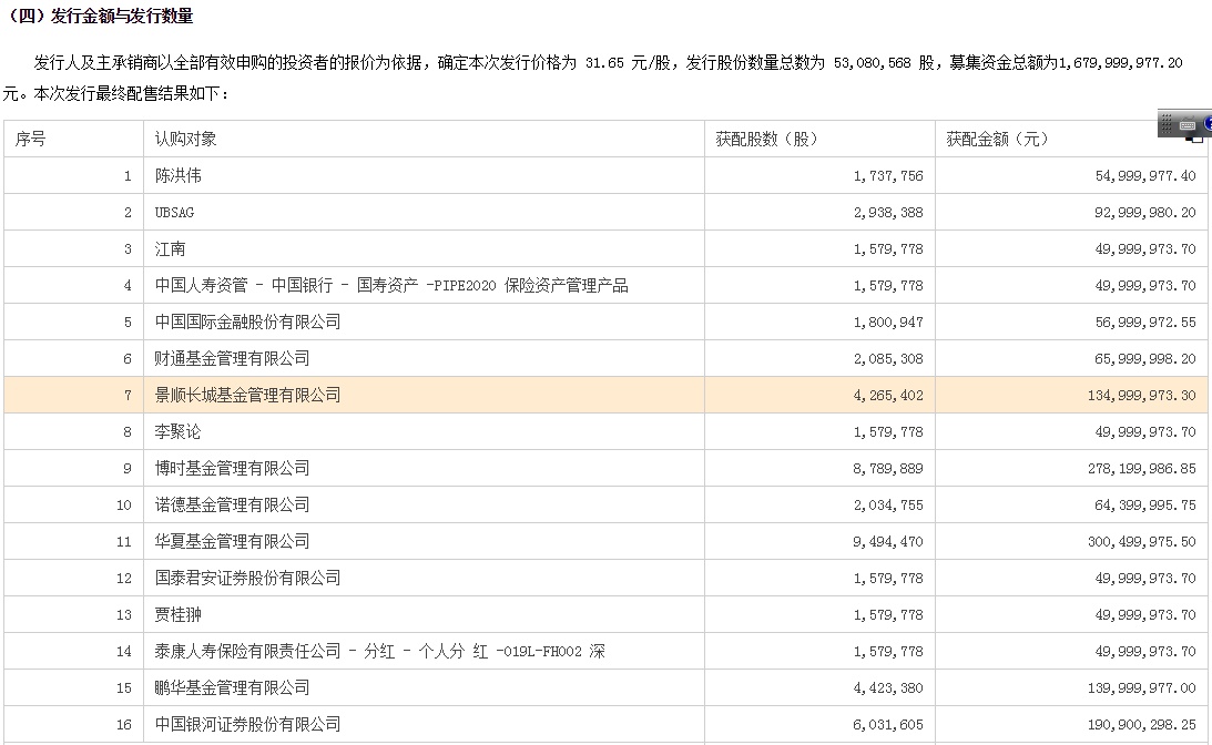 8月10日,亚钾国际披露了募集配套资金非公开发行股票发行情况报告书,确定发行价格为31.65元/股,发行股份数量总数为5308.06万股,募集资金总额约16.80亿元。最终获配对象有16家,包括华夏基金认购949.45万股,获配金额为3亿元;景顺长城基金获配426.54万股,金额为1.35亿元。此外,还有多家机构参与,包括银河证券认购603.16万股、博时基金认购878.99万股、鹏华基金认购442.34万股等。以亚钾国际今日(8月23日)收盘价34.25元/股计算,景顺长城浮盈超1109万元。