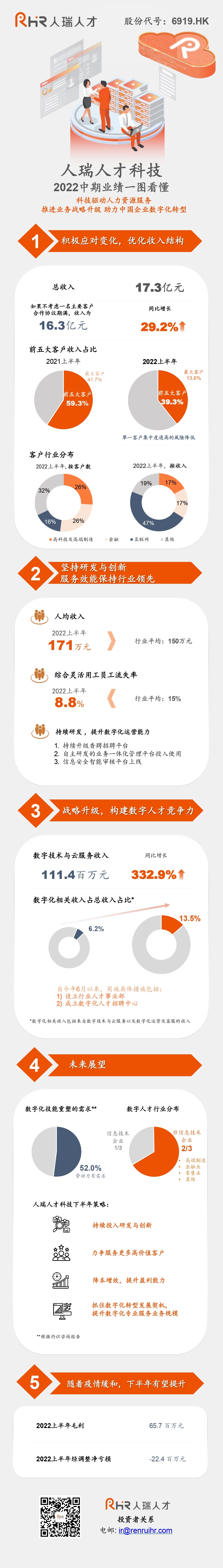 智通财经APP获悉,人瑞人才(06919)发布2022年中期业绩,其中总收入为17.3亿元人民币(单位下同),不考虑一名主要客户合作协议期满,收入为16.3亿元,同比增长29.2%。人均收入达171万元,高于行业同期人均收入150万元 。综合灵活用工员工流失率约8.8% ,远低于行业同期平均流失率的15%。数字技术与云服务收入为1.114亿元,同比增长332.9%。