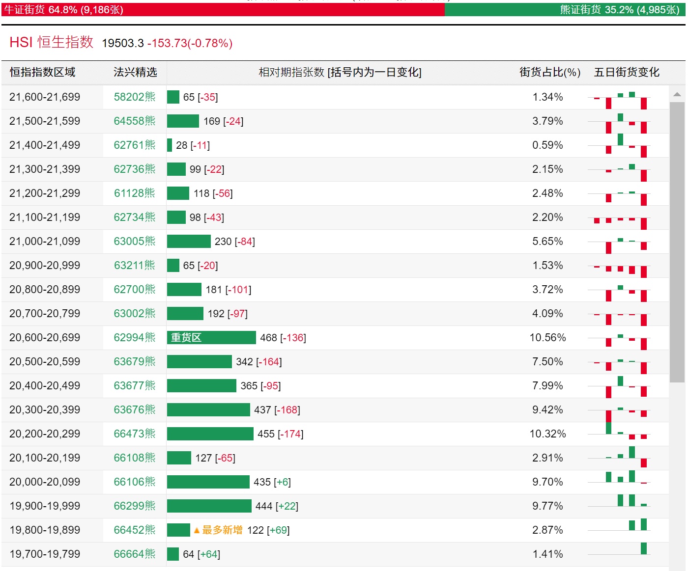 法兴恒指牛熊证街货分布图中的数据显示,熊证街货重货区在20600-20699区间,该区间最新熊证数量为468张,较上一交易日减少136张;最多新增在19800-19899区间,该区间最新熊证数量为122张,较上一交易日增加69张。
