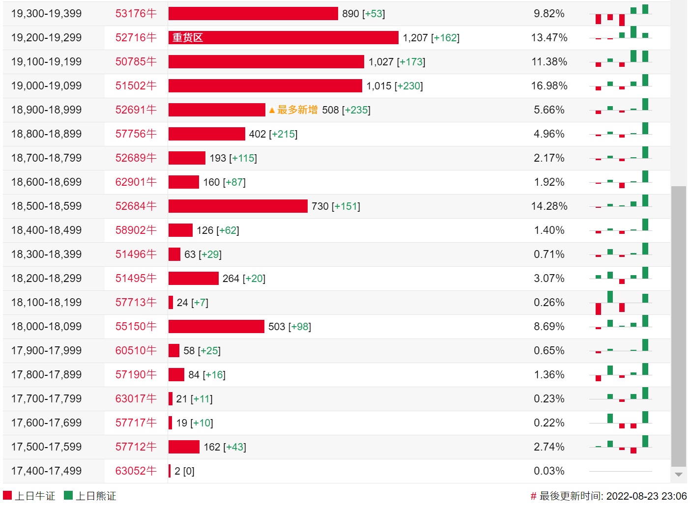 牛证街货重货区在19200-19299区间,该区间最新牛证数量为1207张,较上一交易日增加162张;最多新增在18900-18999区间,该区间最新牛证数量为508张,较上一交易日增加235张。