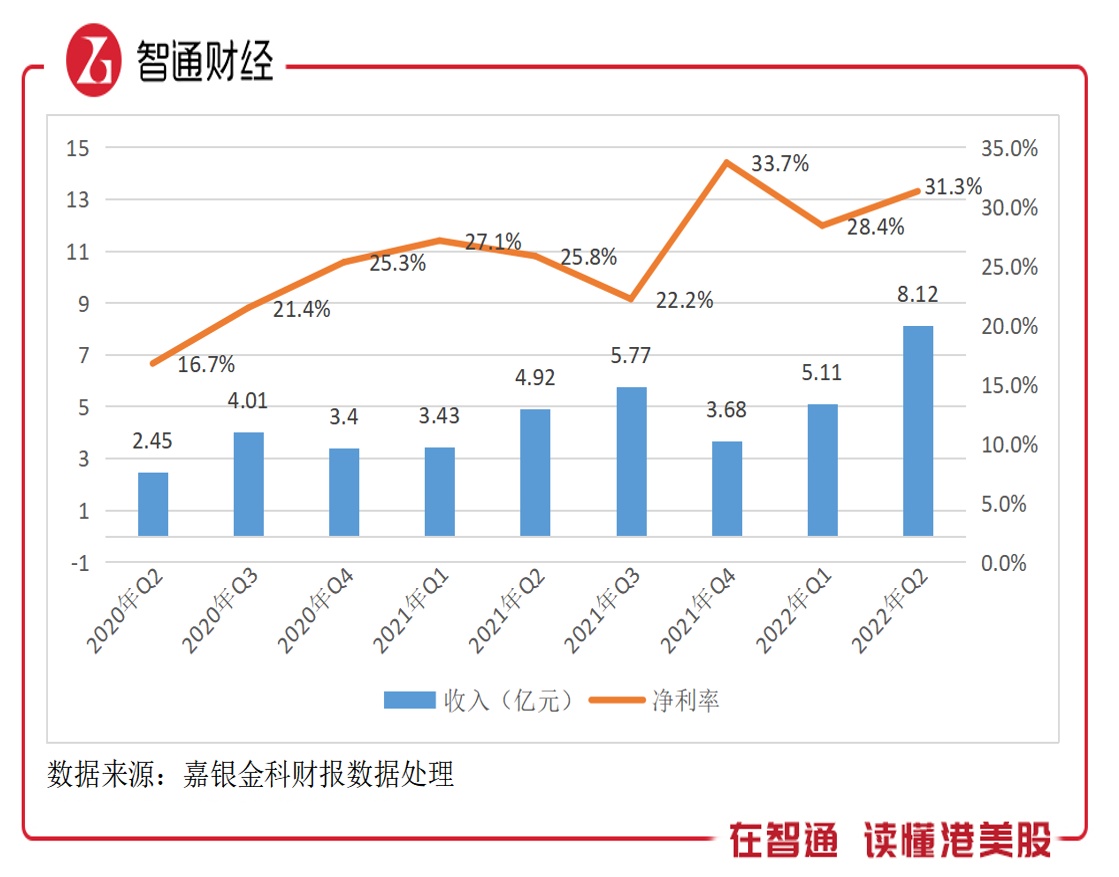 智通财经APP了解到,嘉银金科单季业绩创下新高,按季度看,2022年Q2收入为8.12亿元,股东净利润2.54亿元,分别是2020年同期的3.3倍及6.26倍,净利率也由16.7%提升至31.3%,提升了14.6个百分点。该公司上半年净利率为30.2%,按年持续提升,较2020年度提升10.74个百分点。