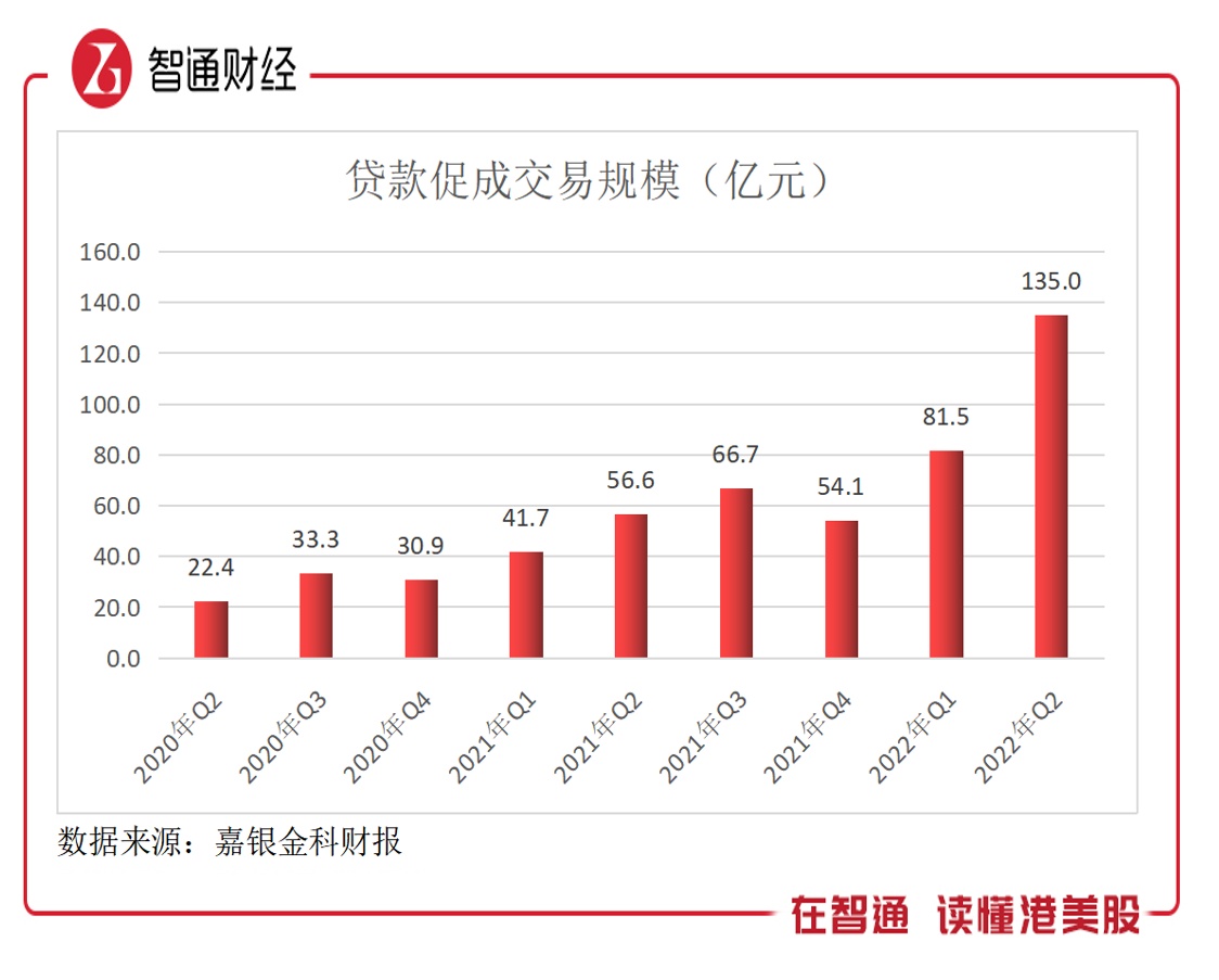 而业绩增长的核心原因是业务规模的不断扩大。该公司于2019年开始转型,2020年Q3完成金融科技平台转型后,凭借平台技术优势以及庞大用户优势,合作机构不断增加,贷款促成交易规模也在逐步发生质的提升。2020年Q2,该公司贷款促成交易规模为22.4亿元,而2022年Q2为135亿元,两年时间增长超过了5倍。