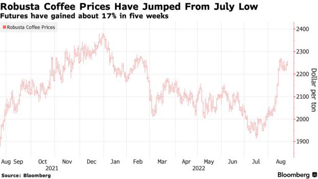 储量减少和收成前景不佳之际,全球咖啡消费正在从疫情导致的市场低迷中复苏。由于从巴西到非洲的供应担忧,罗布斯塔咖啡豆基准价格已较7月中旬的10个月低点飙升了17%。