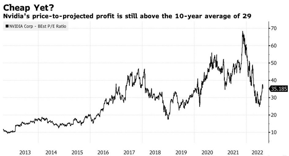 智通财经APP获悉,英伟达(NVDA.US)是今年表现最差的半导体类股之一,不过它的股价还算不上便宜。在经历了今年42%的下跌和超过3000亿美元的市值损失之后,这家芯片制造商的股价比2021年那段令人激动的日子要便宜得多,当时它的市值正缓慢接近1万亿美元。然而,该公司目前的预期市盈率仍为35倍,无论从历史水平还是与同行相比都相当高,尤其是在营收增长预计将放缓的情况下。