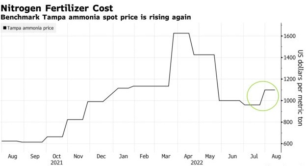 主要生产商 CF Industries高级销售副总裁Bert Frost此前表示,氮市场仍然非常紧张,有限的供应意味着今年晚些时候到2023年可能会出现粮食短缺。仅在7月份,欧洲就有10家化肥厂关闭或减产,情况从现在开始继续变得更糟。人们越来越担心明年将没有足够的肥料。