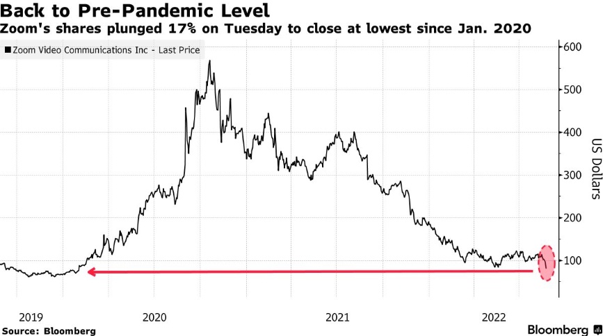 在公布不及预期的二季度业绩并下调三季度和全年业绩指引后,Zoom股价周二收跌17%,创下2020年1月份以来的最低收盘价。Zoom曾经是疫情的主要受益者,但随着工作场所重新开放,该公司一直在苦苦挣扎,并表示来自消费者和小企业的销售额下降速度比预期的更快。