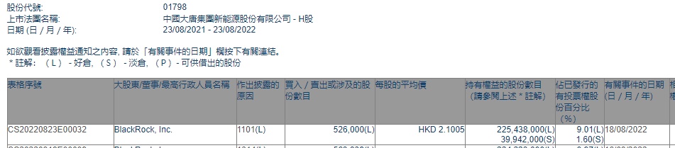 智通财经APP获悉,香港联交所最新资料显示,8月18日,贝莱德增持大唐新能源(01798)52.6万股,每股作价2.1005港元,总金额约为110.49万港元。增持后最新持股数目约为2.25亿股,最新持股比例为9.01%。