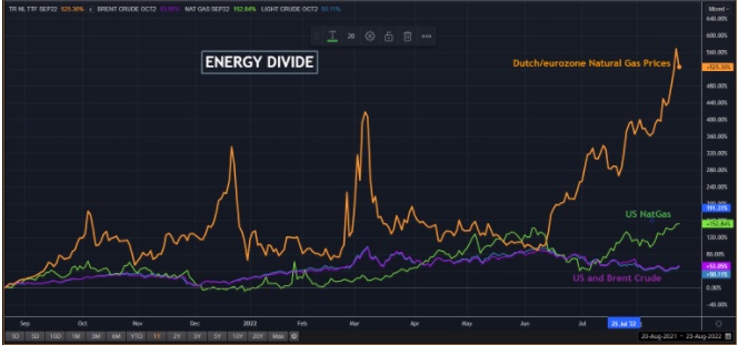 美国国内的每个人目前似乎都被“通胀见顶”这一说法所围绕,自6月以来,该国汽油零售价格下降了逾20%,至每加仑4美元以下,这似乎再次提振了美国经济。而在当前环境下的欧洲,这几乎是不可能看到的情境。