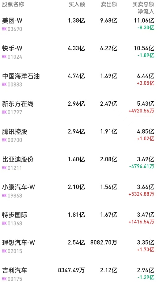 中海油(00883)获净买入4.35亿港元。消息面上,美国石油协会(API)公布的数据显示,美国上周原油库存减少了563万桶,预期为减少150万桶。此外,沙特石油大臣此前表示,期货市场与基本面越来越脱节,欧佩克+可能被迫减产。市场担忧供应趋紧,原油价格延续涨势。周二,WTI 10月原油期货收涨3.74%,报93.74美元/桶;布伦特10月原油期货收涨3.88%,报100.22美元/桶。