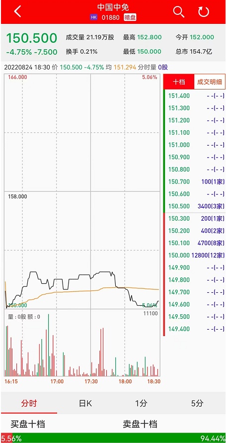 智通财经APP获悉,中国中免(01880)将于8月25日(星期四)在香港挂牌。截至收盘,利弗莫尔证券暗盘交易显示报价150.500港元,较招股价158.000港元跌4.75%。每手100股,不计手续费,每手亏750港元。
