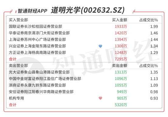 道明光学(002632.SZ):机构与游资产生分歧 ,机构席位卖出906万元,买四是知名游资苏州帮的席位买入1259万元,当日净买入2321万元,该股如突破前期高点,则有望打开上升空间。