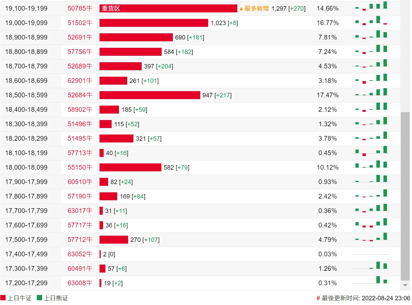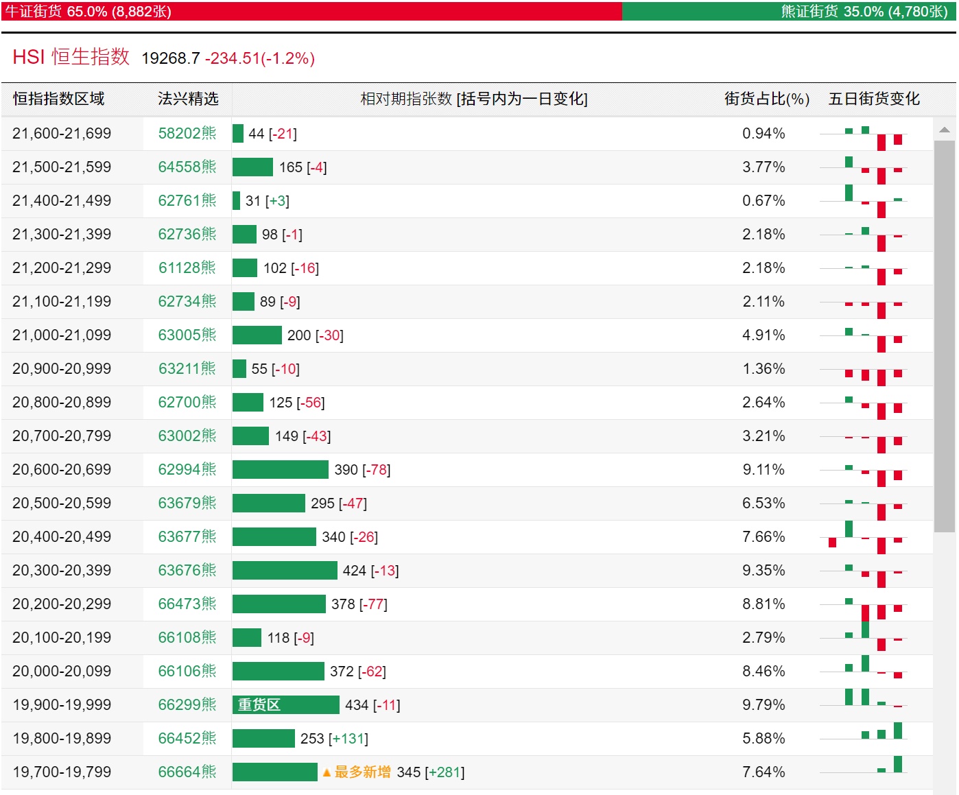 法兴恒指牛熊证街货分布图中的数据显示,熊证街货重货区在19900-19999区间,该区间最新熊证数量为434张,较上一交易日减少11张;最多新增在19700-19799区间,该区间最新熊证数量为345张,较上一交易日增加281张。