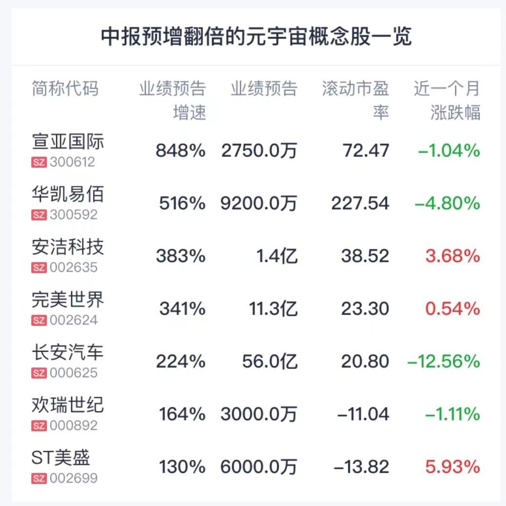腾讯自选股为您梳理了中报大幅预增的元宇宙概念股情况,华凯易佰、安洁科技、完美世界等7股中报预增中值均翻倍起,其中宣亚国际中报预增中值均超8倍位居首位。