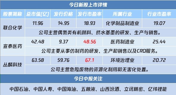 自选哥提示,今日无新股申购,联合化学、宣泰医药、丛麟科技等3只新股上市。今日中报关注中国石油等。