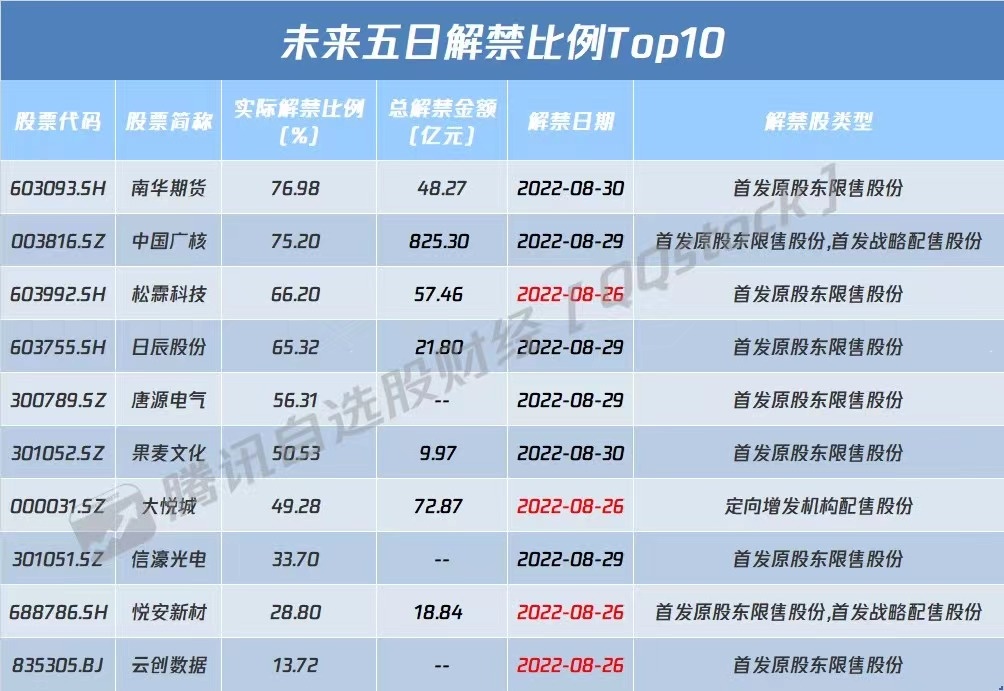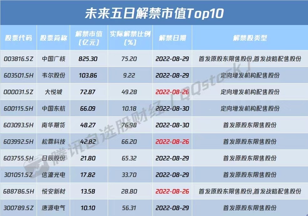 从解禁比例来看,未来五日,中国广核解禁比例达75.2%,其次解禁比例居前的分别为松霖科技和日辰股份;从解禁市值来看,中国广核、韦尔股份、大悦城等股解禁市值居前。