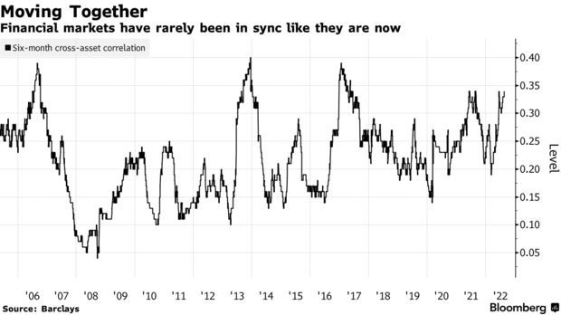 智通财经APP获悉,股票、债券、大宗商品都在同步波动,他们的一致波动几乎完全取决于人们对美联储收紧货币政策是否会导致经济衰退的看法。投资者对经济数据的痴迷和美联储官员的言论推动巴克莱跟踪的跨资产相关性指标几乎翻了一番,成为过去17年来的最高水平之一。