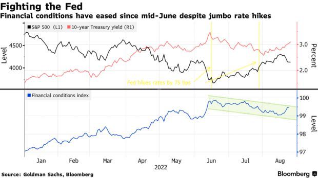 就在美联储6月中旬决定加息75个基点前后,股市和债市开始同步上涨,推动了金融状况的缓解,而这与美联储让利率上升和资产价格下降来缓和过热的需求这一目标背道而驰。