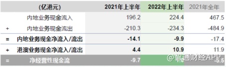 公司有关资料显示,2022年上半年,港澳业务经营现金净流入10.9亿港元,相比去年同期的4.4亿港元大幅提升;内地业务经营现金流净流出额大幅收窄,从去年同期的14.1亿港元,收窄至9.9亿港元。也就是说,港澳业务和内地业务经营现金流出现了同步好转。