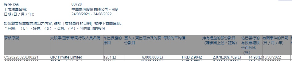 智通财经APP获悉,香港联交所最新资料显示,8月18日,GIC Private Limited减持中国电信(00728)600万股,每股作价2.9042港元,总金额约为1742.52万港元。减持后最新持股数目约为20.78亿股,最新持股比例为14.98%。