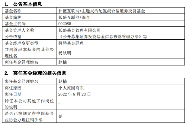 长盛互联网+混合公告显示,该基金的基金经理赵楠因个人原因离职,离职日期为2022年8月23日。共同管理该基金的其他经理为杨秋鹏。