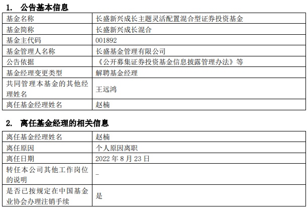 长盛新兴成长混合公告显示,该基金的基金经理赵楠因个人原因离职,离职日期2022年8月23日。共同管理该基金的其他经理为王远鸿。