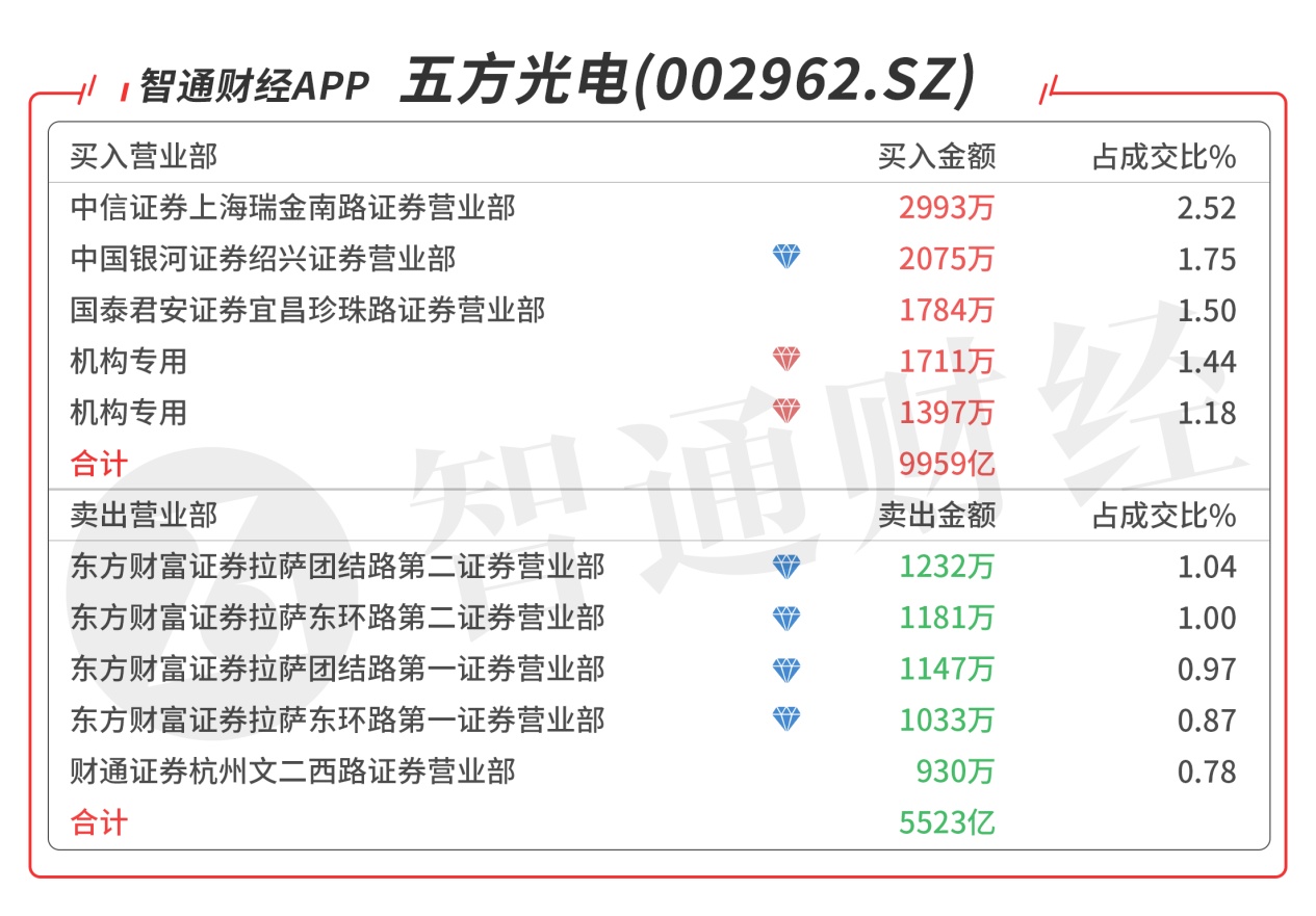 五方光电(002962.SZ):龙虎榜阵容豪华,机构席位买入3108万元,买一是知名游资古北路的席位买入2993万元,买二是顶级游资赵老哥的席位买入1882万元,当日净买入8337万元,该股今日反包,股价创近期新高,看明天能否弱转强。