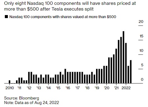 特斯拉拆股之后,纳斯达克100指数成分股将只有8只股票的股价超过500美元。经过今年的抛售和一系列的拆股,股价超过500美元的公司数量比年初减少了一半。