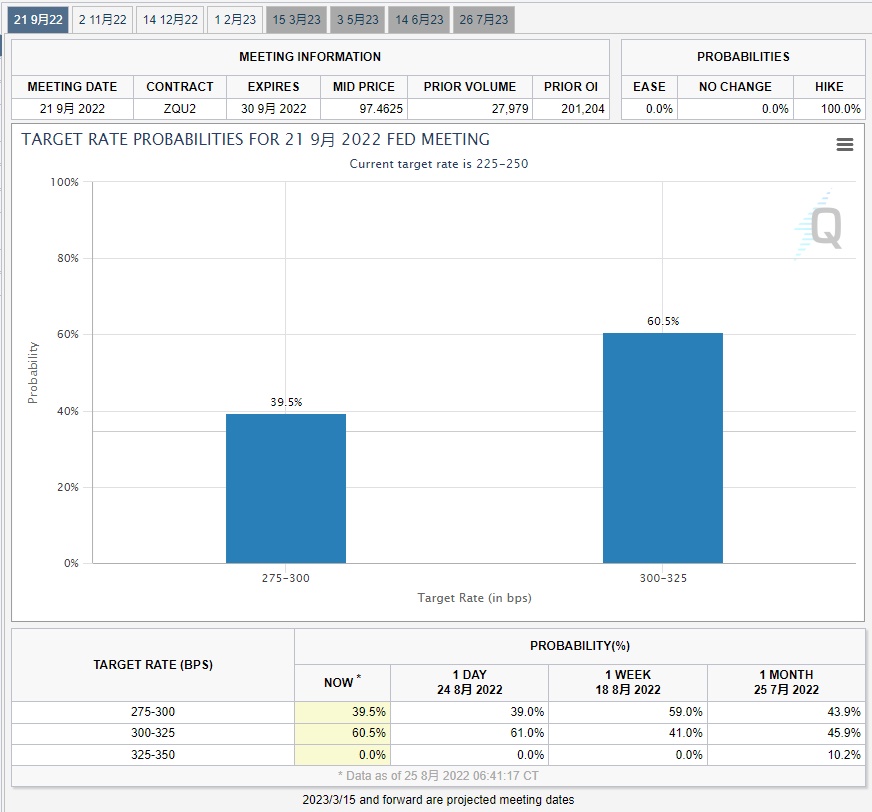 据芝加哥商品交易所集团(CME)的“美联储观察(FedWatch)”工具显示,当前,市场预期美联储在9会议上加息75个基点的概率已经升至60.5%,高于一周前的41.0%;而预期9月会议上加息50个基点的概率则为39.5%,较一周前的59.0%有所回落。