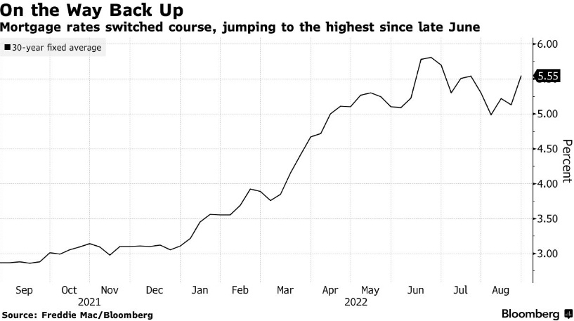 根据房地美周四发布的数据,美国30年期按揭贷款利率均值从上周的5.13%升至5.55%,如果不算6月中旬的一周利率上升55个基点,这一次的房贷利率升幅为2013年以来最大。