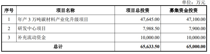 此次募集资金总额拟用于以下项目:约4.76亿元用于年产3万吨碳材料产业化升级项目;约0.8亿元用于研发中心项目;1亿元用于补充流动资金。