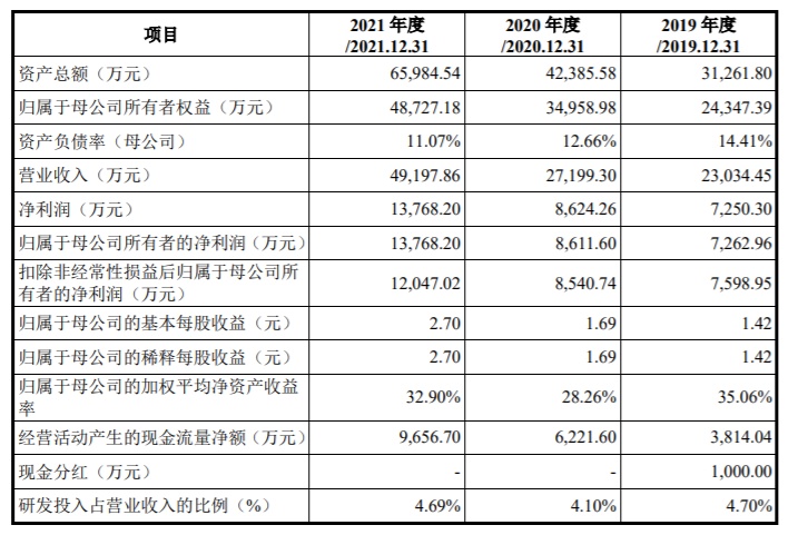 招股书显示,该公司2019年度、2020年度、2021年度营业收入分别约为:2.3亿元、2.72亿元及4.92亿元,归属于母公司所有者的净利润分别为:0.73亿元、0.86亿元及1.38亿元。