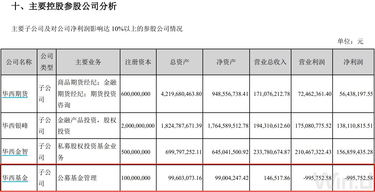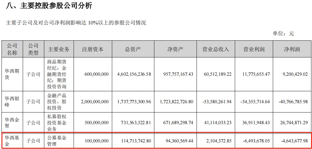 公开资料显示,华西基金成立于2021年11月11日,因此,在华西证券2021年年报中,可以看见,华西基金2021年年末总资产为9960.31万元,净资产9900.42万元。成立至2021年年末,华西基金营收14.65万元,净利亏损99.58万元。
