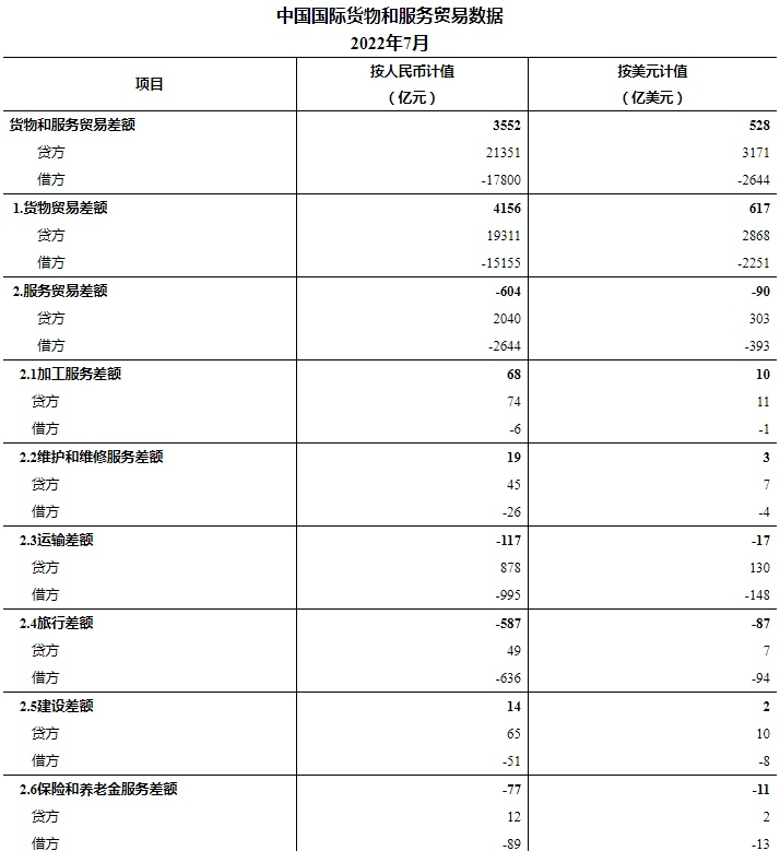 服务贸易主要项目为:运输服务进出口规模1874亿元,其他商业服务进出口规模835亿元,旅行服务进出口规模685亿元,电信、计算机和信息服务进出口规模488亿元。按美元计值,2022年7月,我国国际货物和服务贸易出口3171亿美元,进口2644亿美元,顺差528亿美元。