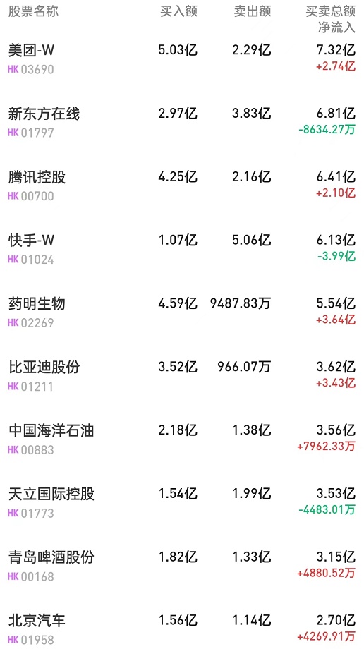 北水净买入最多的个股是比亚迪股份(01211)、中石化(00386)、腾讯(00700)。北水净卖出最多的个股是中海油(00883)、中移动(00941)、中国神华(01088)。