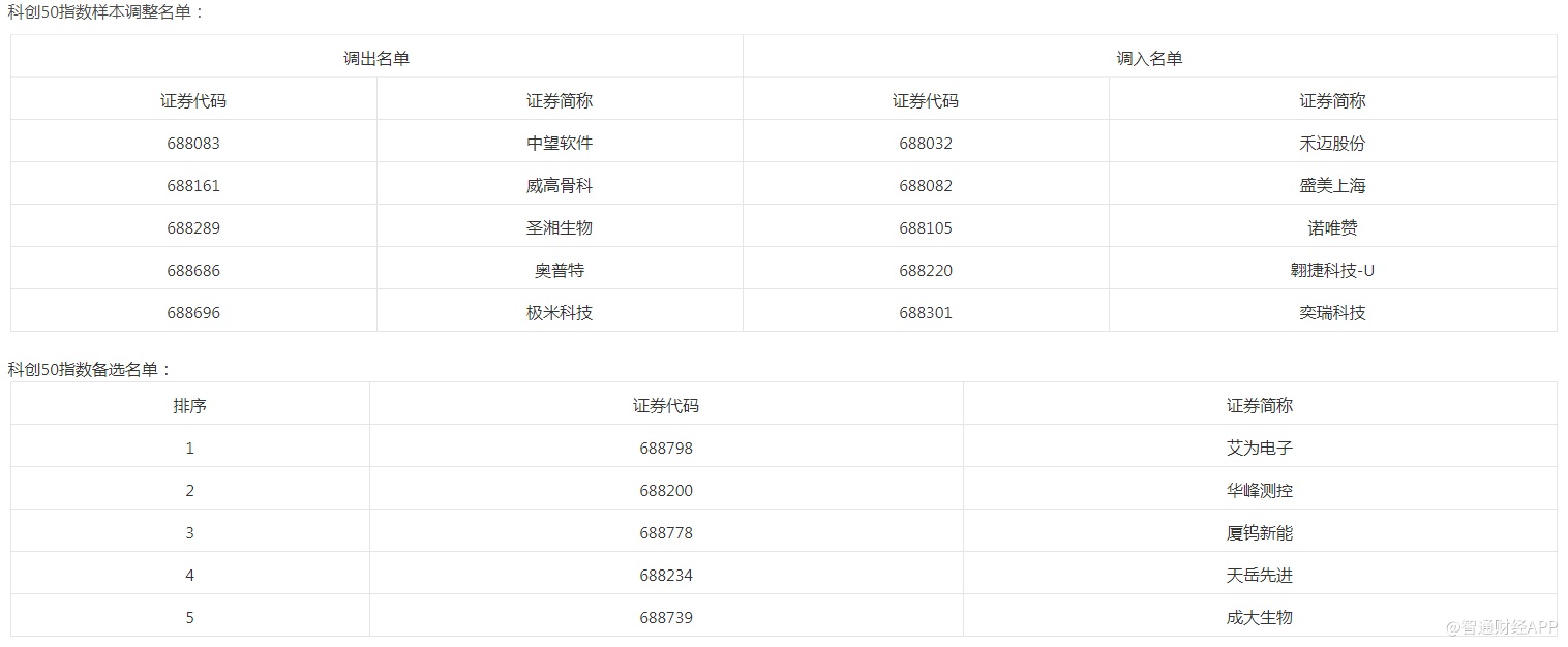 智通财经APP获悉,8月26日,上交所发布关于科创50等科创板指数三季度定期调整结果的公告。根据指数规则,上海证券交易所与中证指数有限公司决定调整科创50、科创信息、科创生物、科创芯片、科创高装、科创材料等指数样本,于2022年9月9日收市后生效。其中科创50更换5只样本,调入禾迈股份(688032.SH)、盛美上海(688082.SH)等5只股,调出中望软件(688083.SH)等5只股。此外,艾为电子(688798.SH)等五只股进入备选名单。