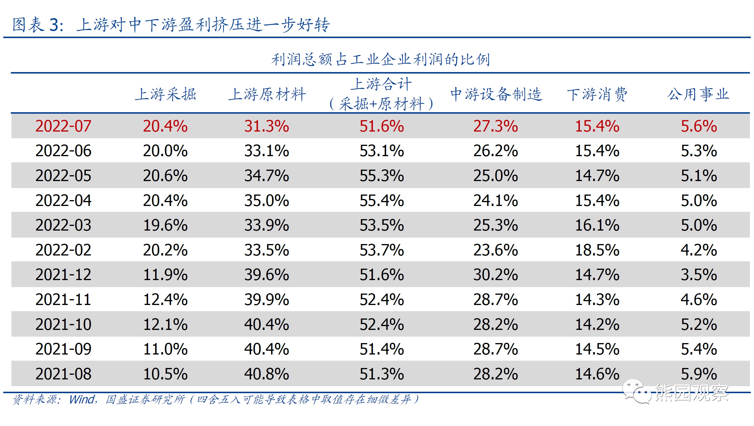 >关注上游对中下游企业盈利挤压缓解的持续性。如前文分析,上游企业盈利占比已连续3个月下滑,且7月降幅进一步扩大,指向上游对中下游挤压不断缓解。