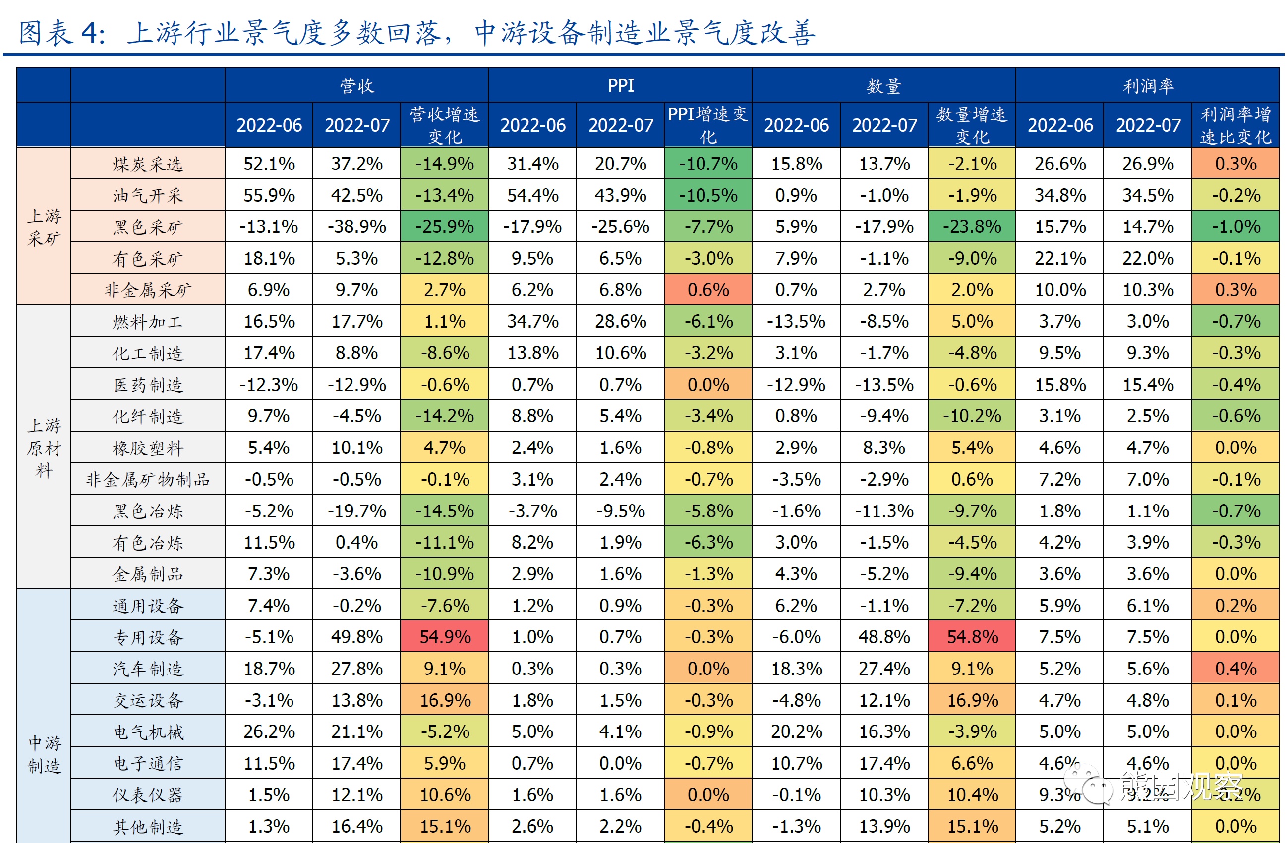 3、往后看,综合考虑季节性、疫情反复、高温干旱、部分区域限电等因素,预计8月工业企业盈利环比可能小升,但单月同比可能延续负增、且累计同比降幅可能进一步走阔,具体有4大关注点,尤其是高温限电、上游对中下游挤压缓解等: