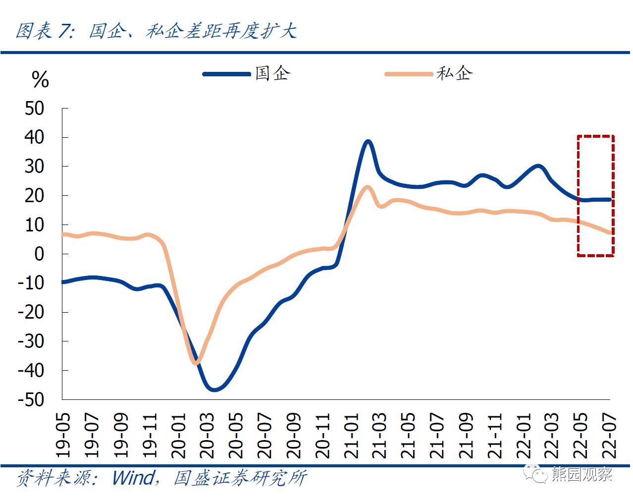 >所有制看:国企、私企差距再度扩大。1-7月国企、私企盈利分别同比增8.0%、降7.1%(前值为增10.2%、降3.3%),私企盈利降幅明显扩大;三年复合增速分别为18.7%、7.2%(前值为18.6%、9.2%),二者差距也进一步扩大。背后的原因可能在于,私企更多地分布于下游消费、服务等行业,受7月疫情反复的冲击更大。