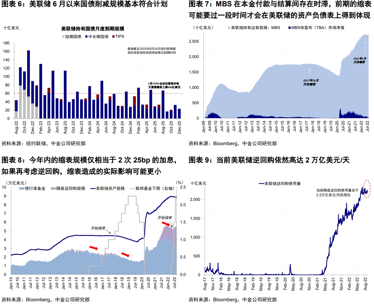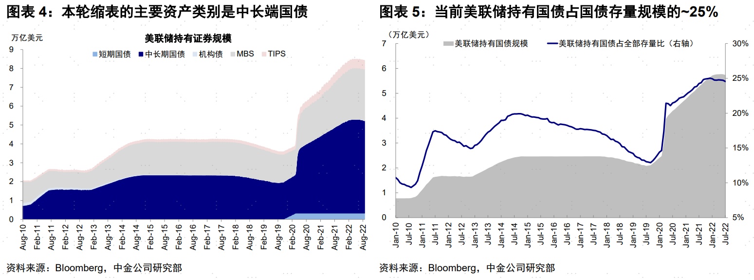 6月开启、9月翻倍;缩减对象主要是中长期国债,MBS不降反增美联储6月启动缩表、采用到期不续作方式,前3个月(6~8月)每月缩表上限475亿美元(300亿国债+175亿MBS);9月后翻倍,上限提高至950亿美元(600亿国债+350亿MBS)。缩减对象主要为中长期国债,短端基本不变;MBS不降反增。
